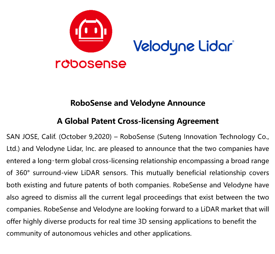 RoboSense and Velodyne Announce A Global Patent Cross-licensing Agreement