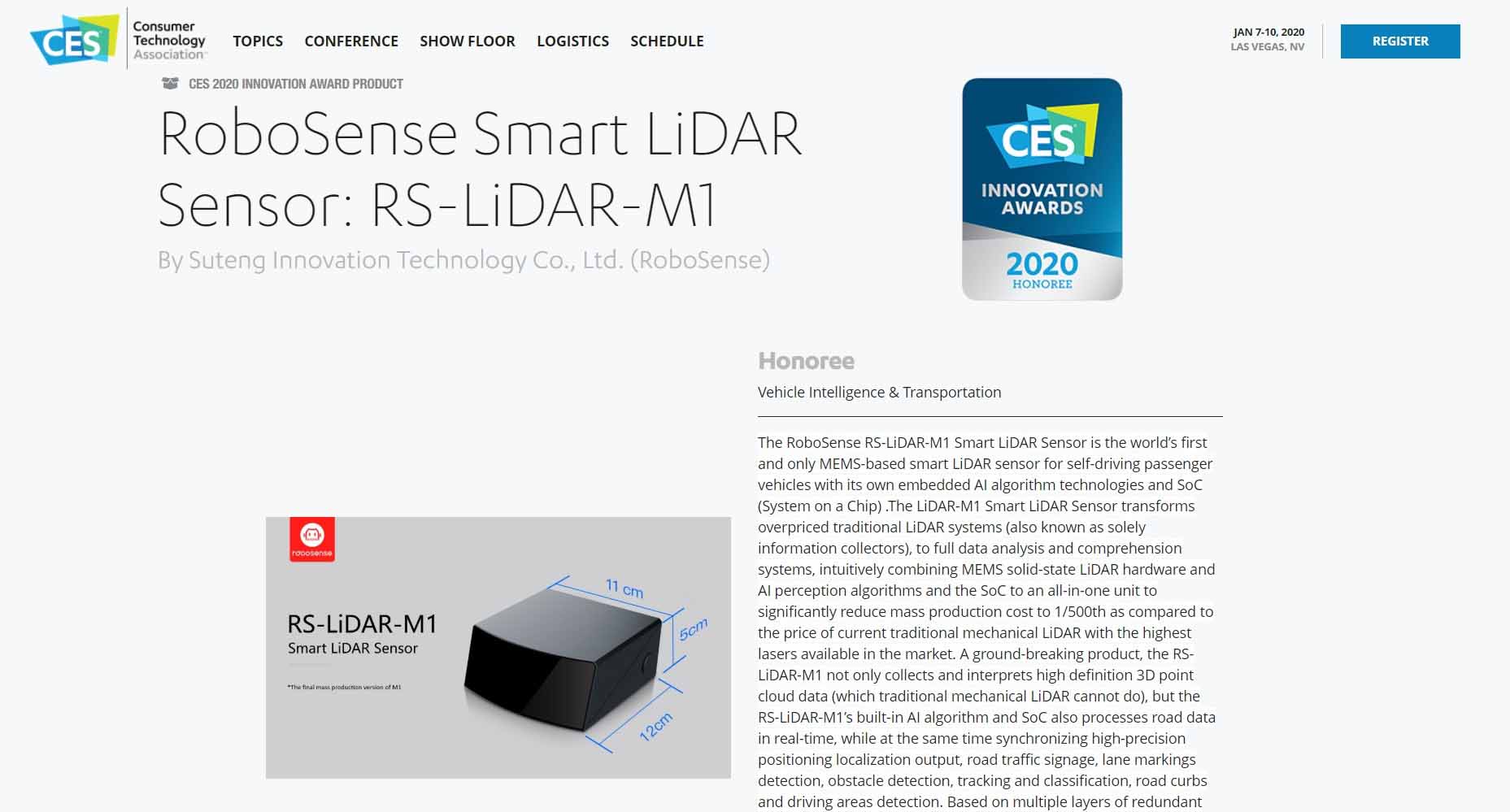 RoboSense连续两年荣获CES创新奖,继获得CES 2019 创新奖后,今年凭借进化了的M1 Smart LiDAR Sensor再次得奖。本届CES消费电子展将于2020年1月7~10日在美国拉斯维加斯举办,届时我们将携最新版RS-LiDAR-M1,在 LVCC North Hall Booth 6138 与大家见面。